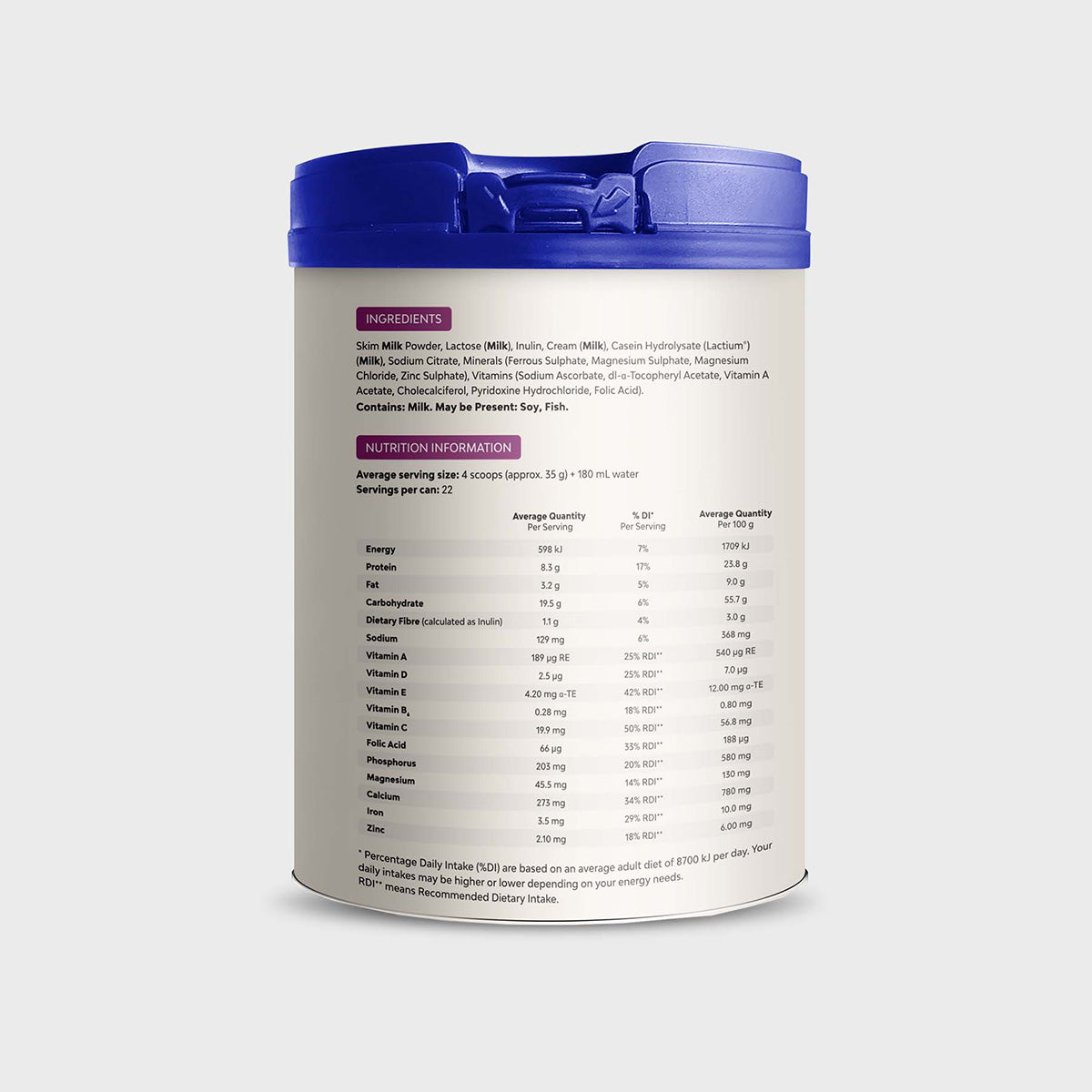 Skim Milk Powder, Lactose (Milk), Inulin, Cream (Milk), Casein Hydrolysate (Lactium®) (Milk), Sodium Citrate, Minerals (Ferrous Sulphate, Magnesium Sulphate, Magnesium Chloride, Zinc Sulphate), Vitamins (Sodium Ascorbate, dl-α-Tocopheryl Acetate, Vitamin A Acetate, Cholecalciferol, Pyridoxine Hydrochloride, Folic Acid).
