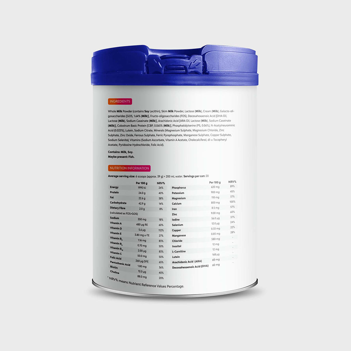 Whole Milk Powder, Skim Milk Powder, Lactose, Cream, Galacto-oligosaccharides (GOS), Fructo-oligosaccharides (FOS), Docosahexaenoic Acid (DHA), Arachidonic Acid (ARA), Colostrum Basic Protein (CBP}, Phosphatidylserine (PS), N-Acetylneuraminic Acid, Lutein, Minerals {Magnesium Sulphate, Magnesium Chloride, Zinc Sulphate, Zinc Oxide, Ferrous Sulphate, Ferric Pyrophosphate, Manganese Sulphate, Copper Sulphate, Sodium Selenite), Vitamins (Sodium Ascorbate, Vitamin A Acetate, Cholecalciferol, dl-a-Tocopheryl Acetate, Pyridoxine Hydrochloride, FolicAcid).