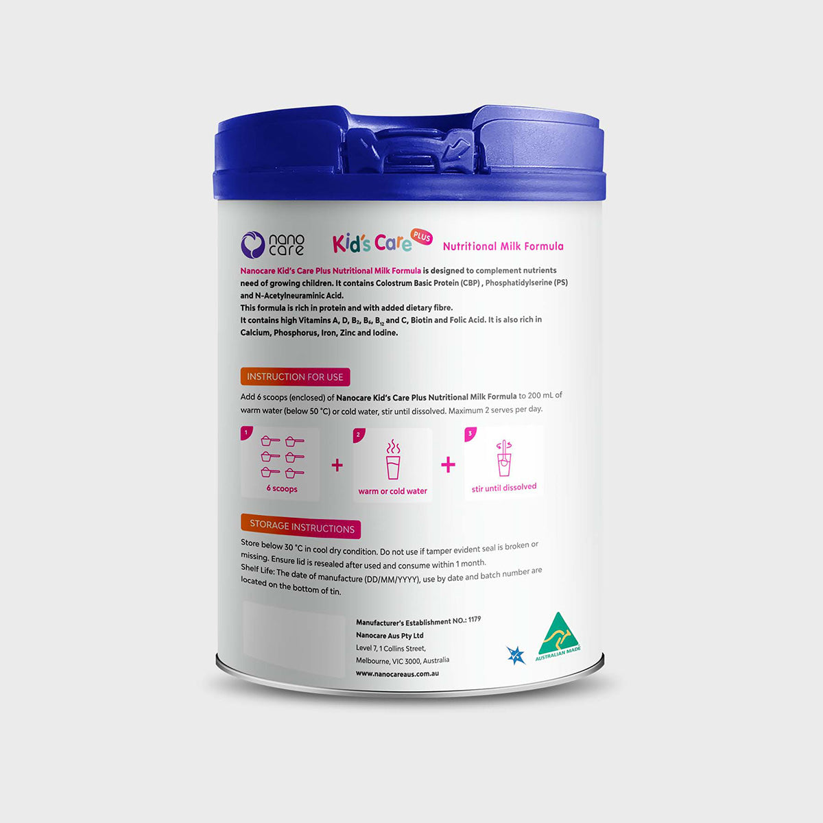 Add 6 scoops (enclosed) of Nanocare Kid’s Care Plus Nutritional Milk Formula to 200 ml of warm water {below 50 °C) or cold water, stir until dissolved. Maximum 2 serves per day.